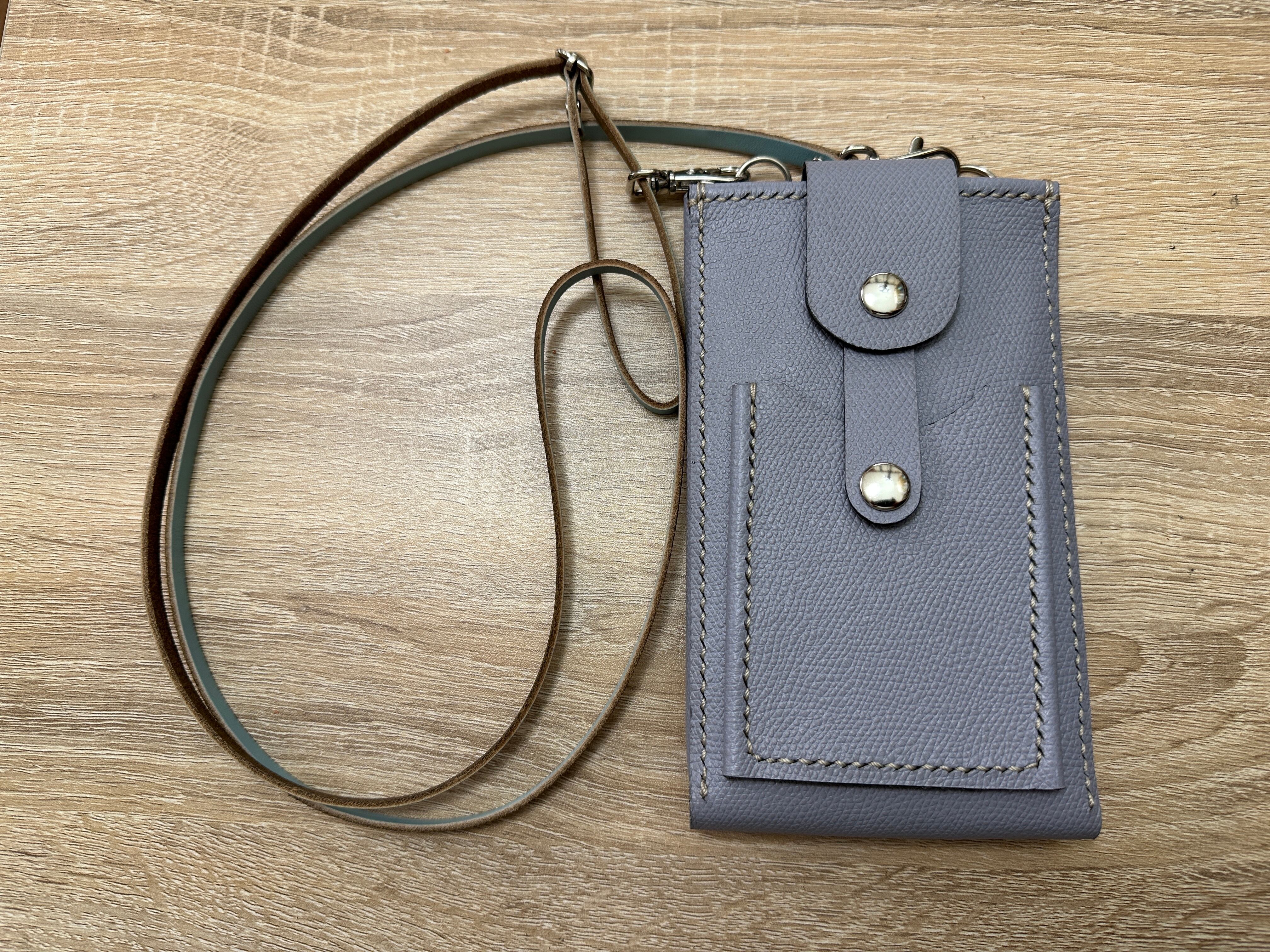 手作りで作られた本革のスマホポーチ。持ち運びに便利なサイズ感。