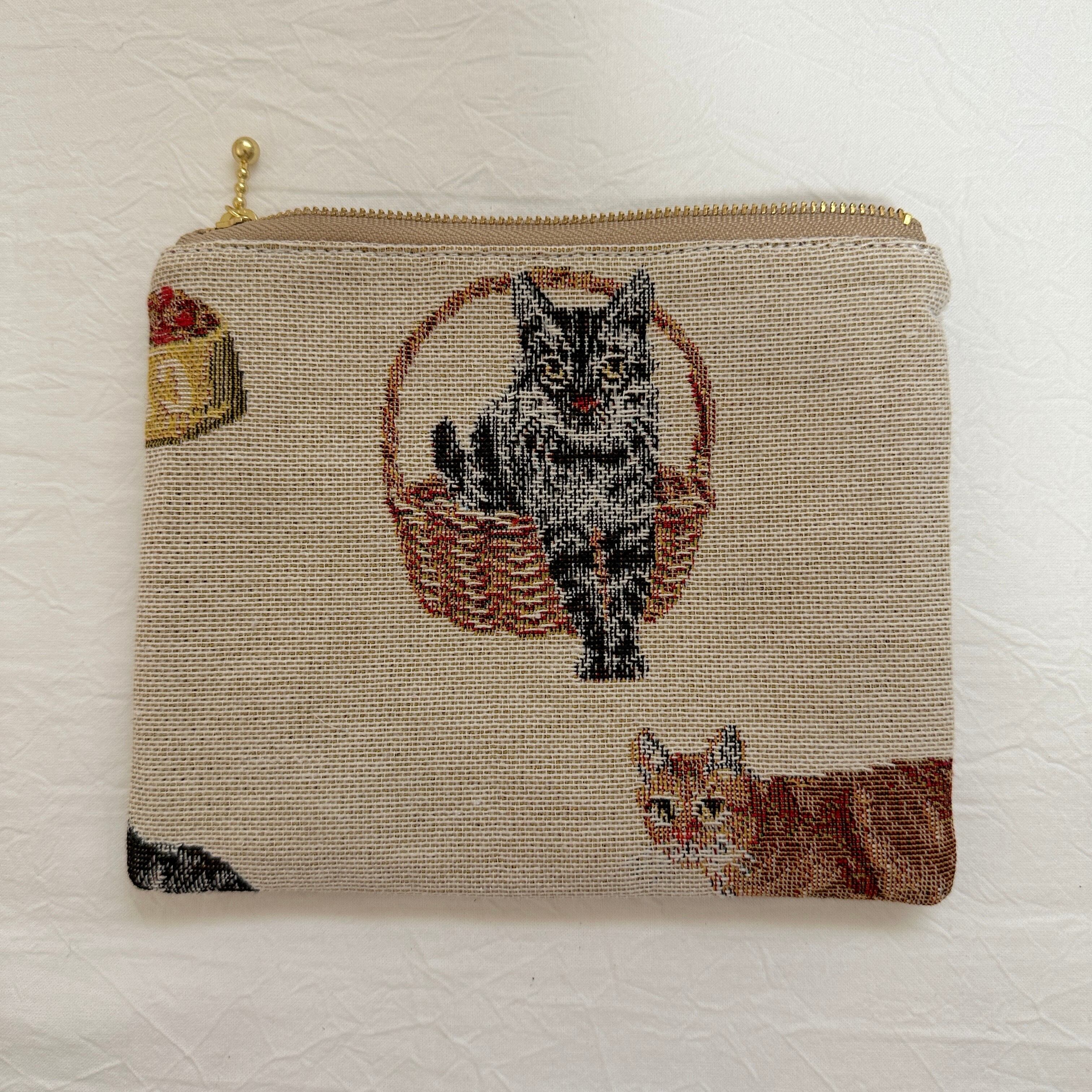 可愛い猫柄の布を使用した手作りのポーチです。裏地は細かい花柄模様になっています。猫好きの方には嬉しいポーチです。